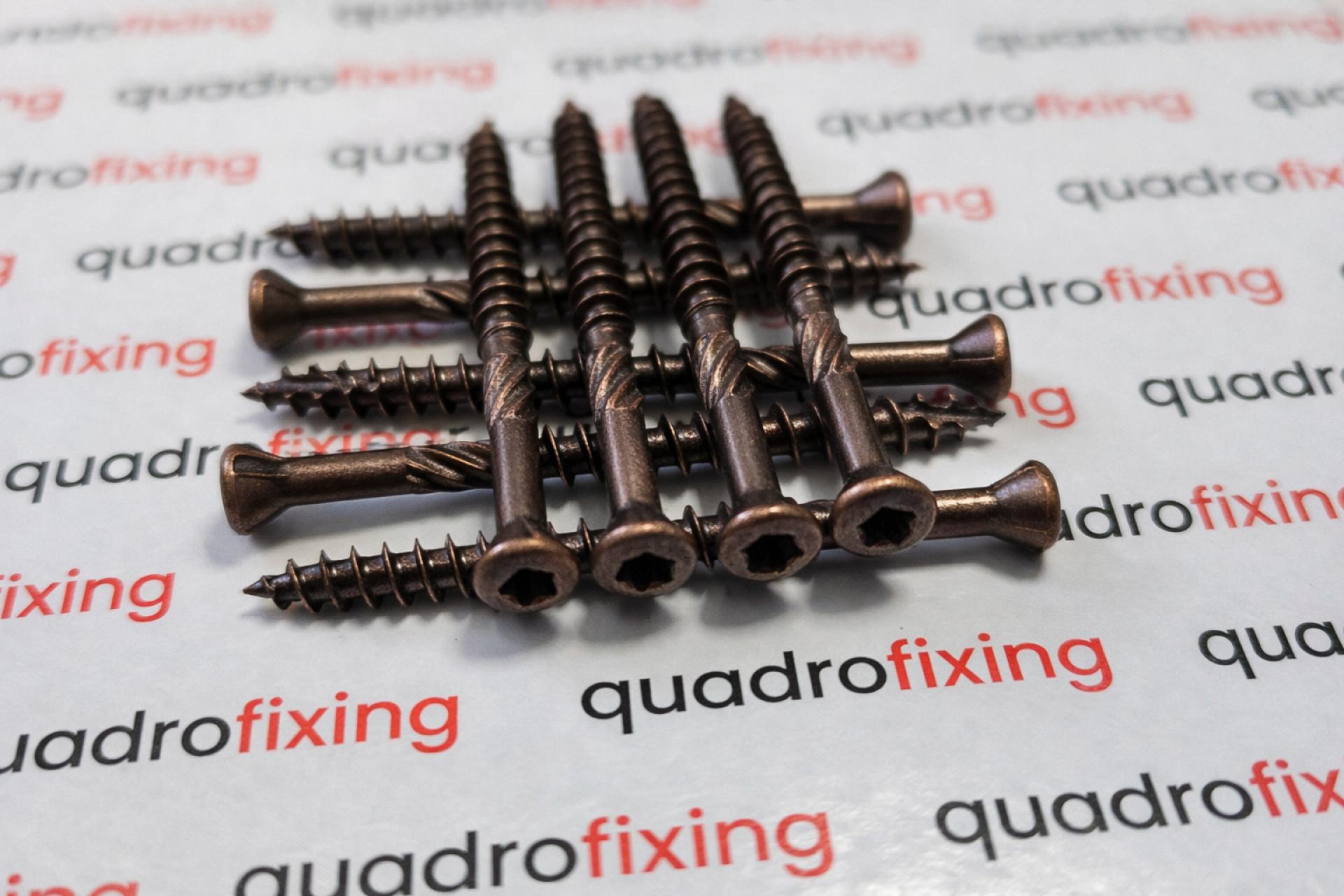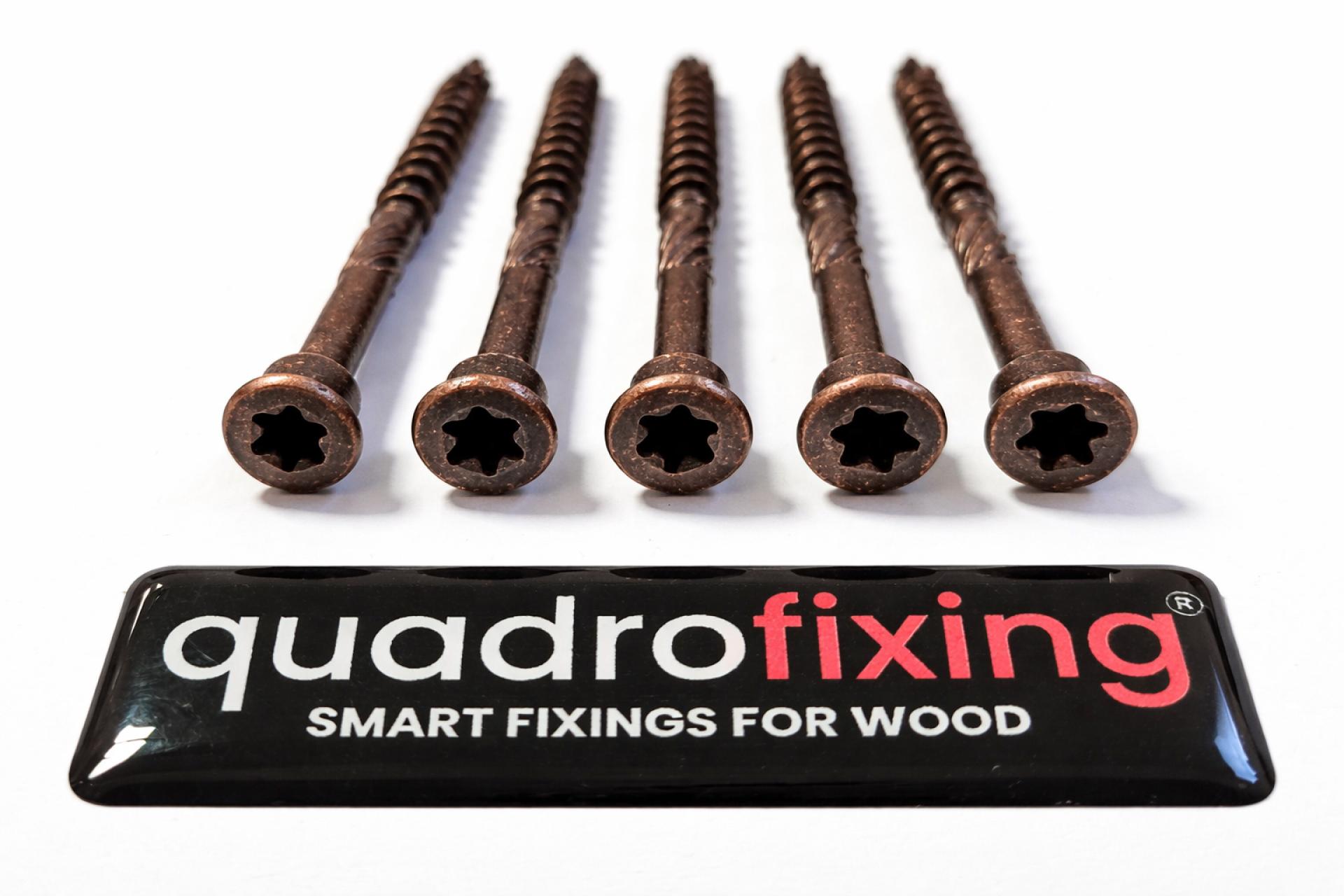 Nižšie uvádzame reálne fotografie výrobcu quadrofixing, konkrétne skrutiek QUADROFIX ANTIK a TERRIX ANTIK. Pri týchto produktoch je antik úprava farebne zjednotená, s charakteristickým tmavohnedým, matným vzhľadom, ktorý na dreve pôsobí prirodzene a nenápadne.