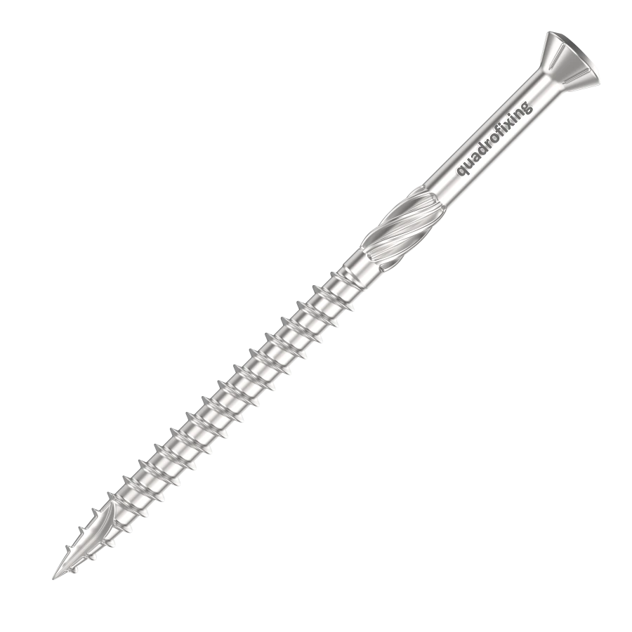Skrutky sú vyrobené z austenitickej nerezovej ocele A4 a vybavené samovrtnou špičkou, ktorá umožňuje montáž bez predvŕtania a minimalizuje riziko poškodenia dreva. Frézujúci závit spolu s frézovacími drážkami pod hlavou znižuje uťahovací moment a zabezpečuje čisté zapustenie hlavy bez vytrhávania vlákien. Ozdobná hlava s uhlom 60° vytvára estetický výsledok montáže. Pohon skrutky je TX10 (Torx 10).
